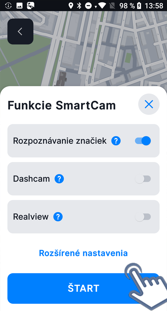SmartCam je funkcia dostupná od verzie aplikácie 22.1.1, ktorá umožňuje používať funkcie, využívajúce fotoaparát zariadenia súčasne (Rozpoznávanie značiek, Dashcam, Real View Navigácia).