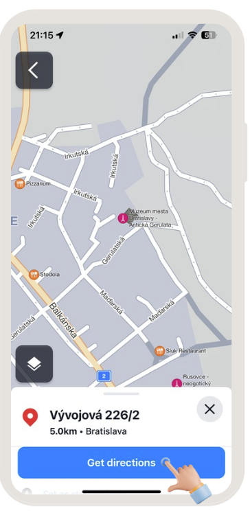 Auf ähnliche Weise können Sie einen Ort (Sehenswürdigkeit) finden, indem Sie auf der Karte nachsehen und auf das Symbol tippen, das ihn darstellt, z. B. Restaurants, Tankstellen oder Geschäfte. Tippen Sie auf ein beliebiges Symbol und wählen Sie „Wegbeschreibung anzeigen“ im blauen Feld am unteren Bildschirmrand.