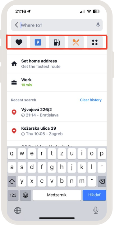 You can search for nearby places through the search bar, tap on the three dots to open a list of all available categories, and select a category and the app will display the nearest places of this type. In the bottom bar, you can browse the list of names with your current distance from these points. You can choose a specific point by clicking on a point on the map or by selecting from the list.
