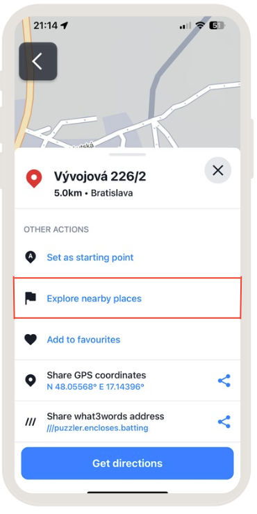 You can also browse places (points of interest) anywhere in your chosen area, not just in your current area. Click anywhere on the map and swipe up to open the destination details. Then click on Explore nearby places.