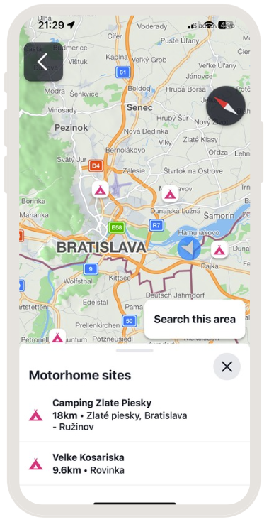 Tryb kampera pomaga zapewnić bezpieczniejsze i wygodniejsze planowanie trasy dla większych pojazdów — biorąc pod uwagę ograniczenia wysokości, limity wagowe i inne specyficzne cechy podróży kamperem.