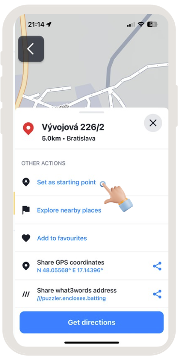 Aplikacja Sygic GPS Navigation wykorzystuje aktualną lokalizację użytkownika jako domyślny punkt początkowy do obliczania trasy. Aby zmienić punkt początkowy, należy postępować tak samo, jak przy wyborze miejsca docelowego. Jednakże zamiast ustawiać punkt jako miejsce docelowe, należy przesunąć palcem w górę na dolnym pasku z przyciskiem „Uzyskaj wskazówki”.