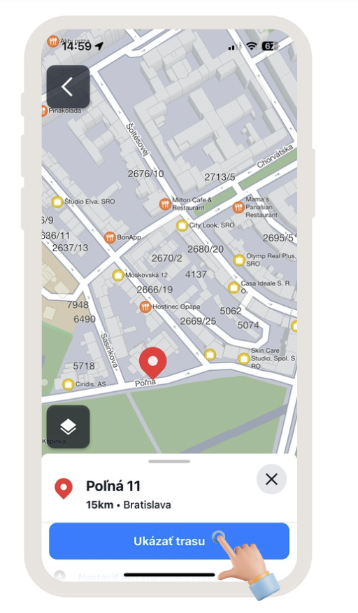 Rovnakým spôsobom môžete nájsť aj Miesto (bod záujmu). Prezrite si mapu a kliknutím označte ikonu symbolizujúcu bod záujmu, takto sú zobrazované napríklad reštaurácie, čerpacie stanice, obchody atď. Klepnite na ktorúkoľvek z nich a zvoľte možnosť Ukázať trasu v modrom ráme na spodku obrazovky.