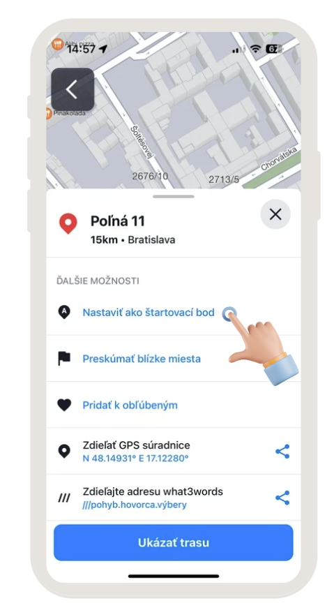 Sygic GPS Navigation štandardne používa vašu aktuálnu polohu ako štartovací bod pri výpočte trasy. Ak chcete zmeniť štartovcí bod, postup je rovnaký ako pri výbere cieľa, avšak namiesto označenia bodu ako cieľa trasy potiahnite nahor spodnú lištu s tlačidlom „Získať trasu“.