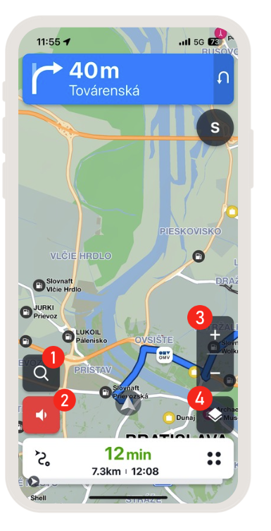 - Informačný panel (zostávajúci čas do cieľa, predpokladaný čas príjazdu, zostávajúca vzdialenosť do cieľa)
