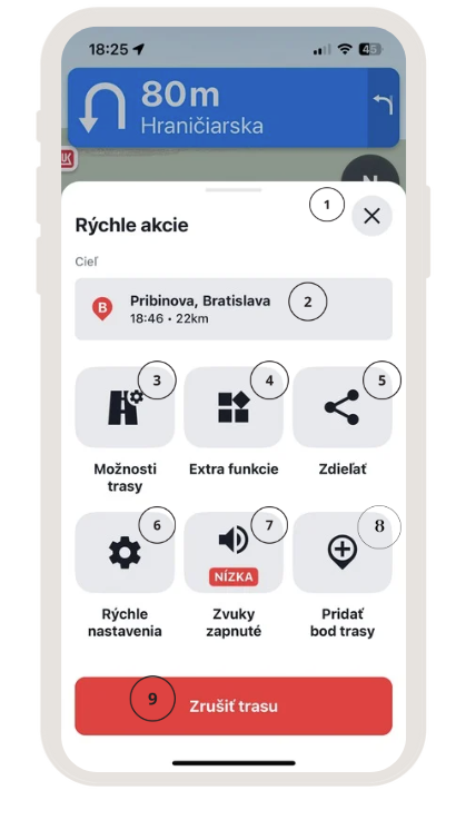 - Zrušiť trasu – Zruší trasu, ktorú ste práve nastavili na navigáciu.