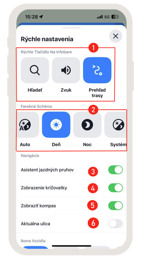 - Asistent jazdných pruhov – zapnutie alebo vypnutie zobrazenia navádzania do jazdných pruhov.