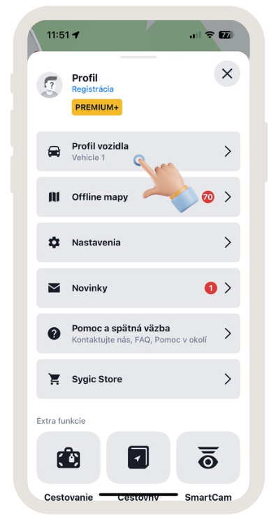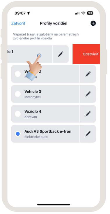 Upozorňujeme, že prvý profil vozidla je možné iba upraviť, nedá sa vymazať. Akýkoľvek ďalší následne pridaný profil vozidla je možné vymazať kliknutím na profil, ktorý chcete vymazať a potiahnutím prsta doľava.