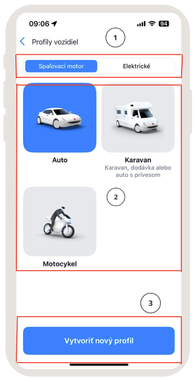 2. Vyberiete si typ vozidla- Auto, Karavan alebo Motocykel (Camper mode je extra platená funkcia)