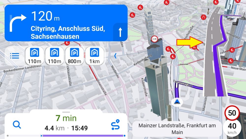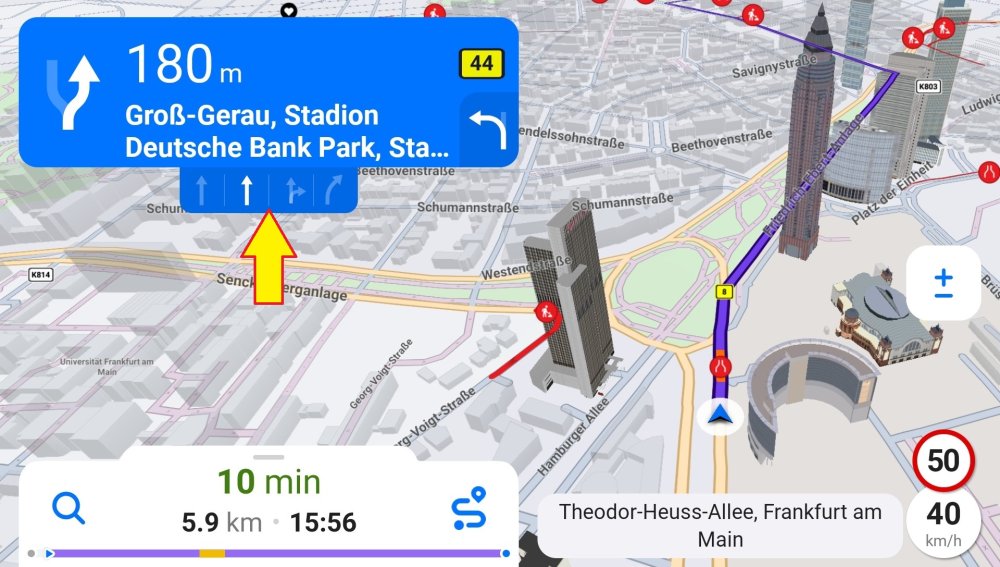 If enabled, the lane guidance feature is shown at important intersections, highway exits and similar roads with several lanes. Lanes that you should follow are highlighted.