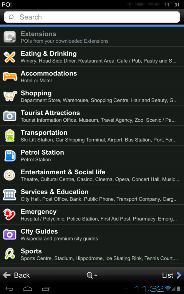 When searching POIs by any means described in the previous topic, the POIs are displayed in List view.