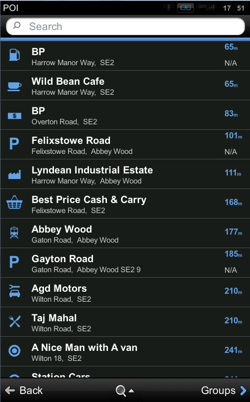 To refine your search results, tap the search icon at the bottom of the screen and type the name of the POI or group you are looking for (depending on a view). You can also enter partial names. When finished, the Action Menu pops up.