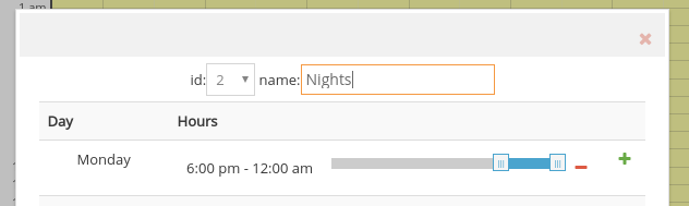- A new panel will pop up in your screen, in which you can select the times for your schedule. Click on the plus sign (+) for each day of the week.