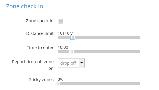 - Check-in en otras zonas: Los conductores podrán acceder a zonas en las que no se encuentran realmente. Los modificadores, Límite de distancia y Tiempo de entrada, se pueden utilizar para determinar qué tan lejos (en unidades de tiempo o distancia) puede estar un conductor de una zona para poder registrarse en ella.