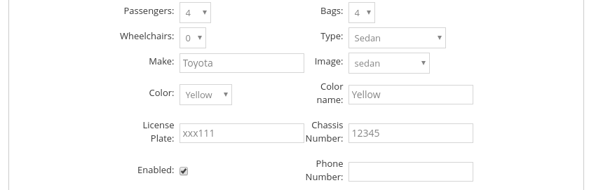 - Puedes especificar todas las características de tu vehículo virtual para que coincidan con el vehículo real. Ingresa el número de pasajeros, equipajes y sillas de rueda que soporta el vehículo, el tipo, marca, color, placa, entre otros. Puedes agregar tanta o tan poca información como sea necesario de acuerdo a las leyes de tu país or región. Solo el número de pasajeros, equipajes y sillas de ruedas son campos obligatorios.