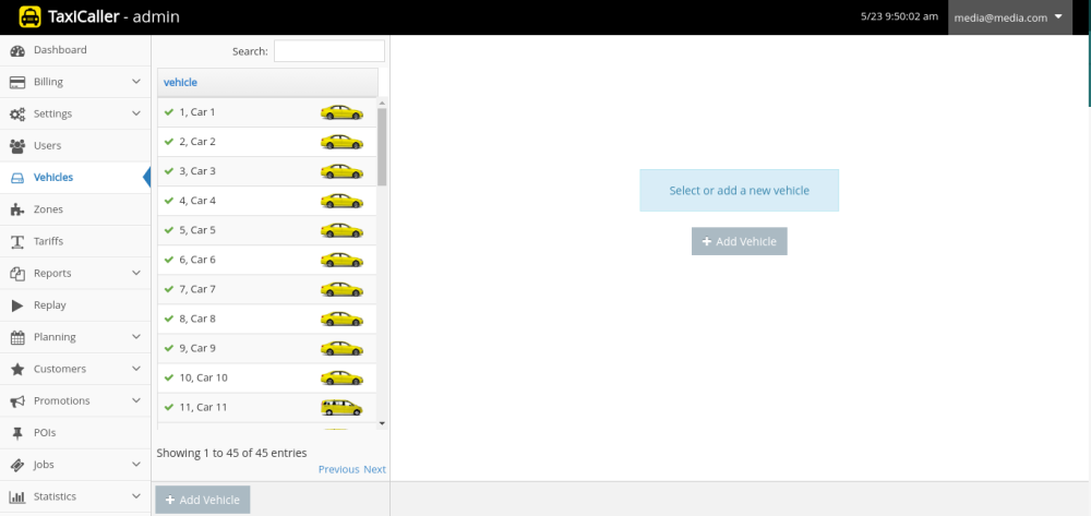 Navega hacia la sección de Vehículos en el panel de administración, para crear y administrar tus vehículos. Puedes usar la barra de búsqueda en la parte superior para filtrar tus vehículos en caso de haber una gran cantidad de estos.