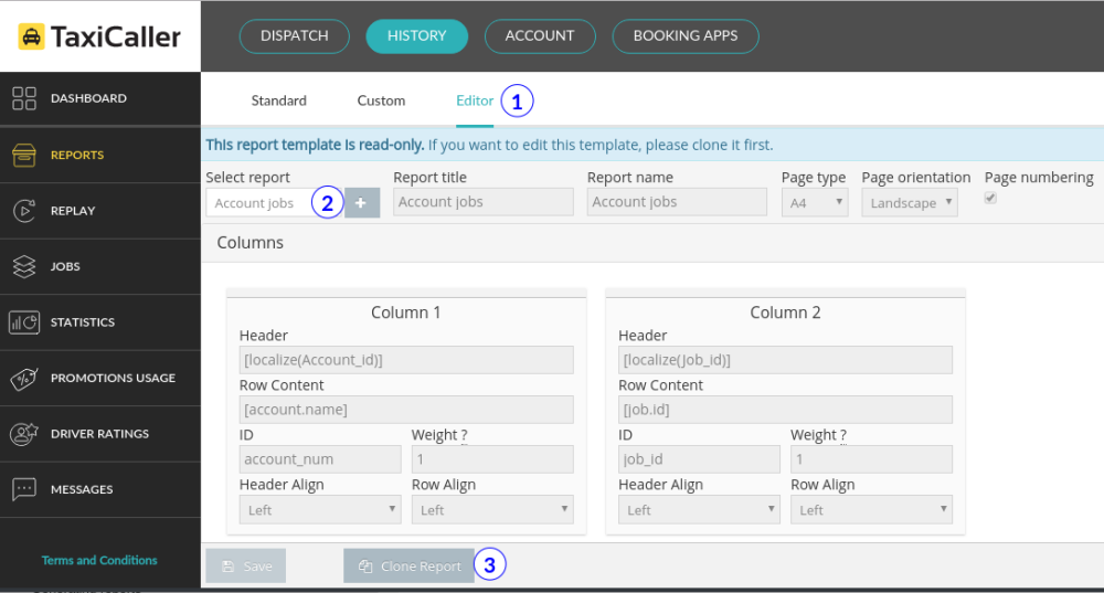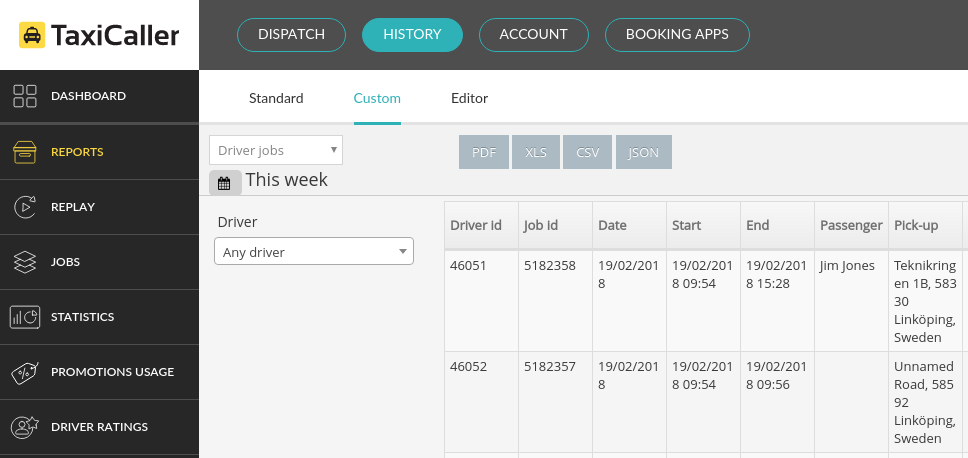 If you need to generate reports with information that is not easily displayed in the Standard Reports, you can use Custom ones. We have 5 built-in types, namely for Account jobs, Driver jobs, Finished jobs, Multi company and Zone-report. They generate dynamically which means that you don’t have to press a button to generate them.