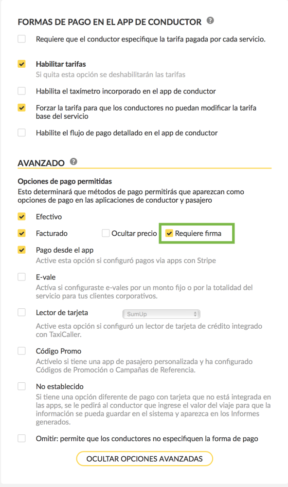 - Encuentra formas de pago del conductor y mostrar opciones avanzadas.