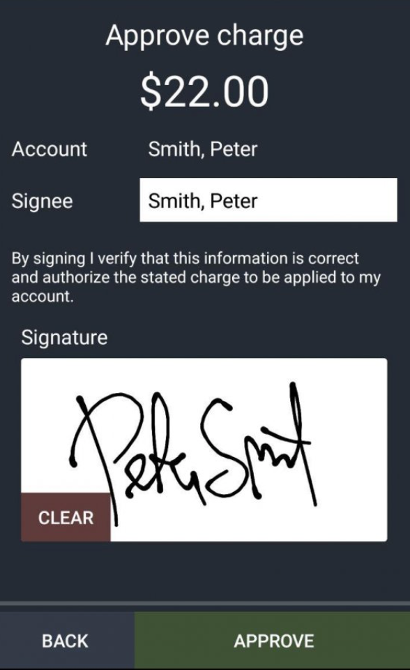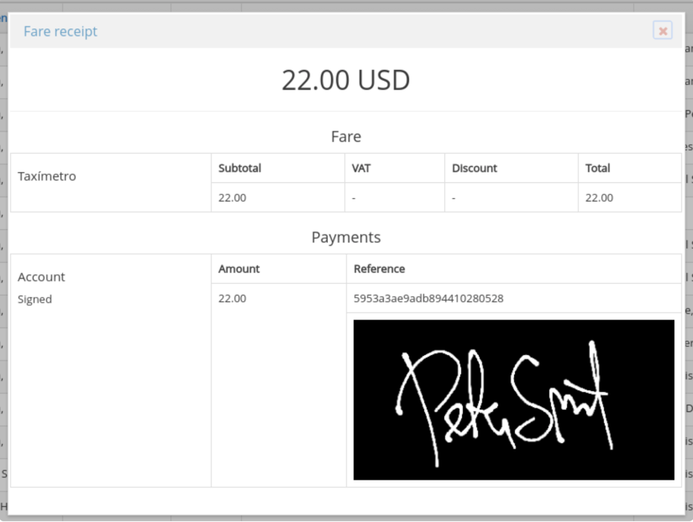 La nueva pantalla de firma se mostrará al agregar un pago de cuenta si es necesario para ese cliente. Después de que el pasajero firme el pago en la tableta o teléfono inteligente, la firma estará visible en el recibo de ese servicio en el Editor de servicios en el Panel de administración.