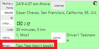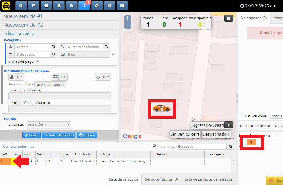 Verás esta configuración visible en las diferentes partes de la Central de desde Despacho: colas en zona, detalles del servicio, y en el mapa el icono del vehículo también cambiará de color.