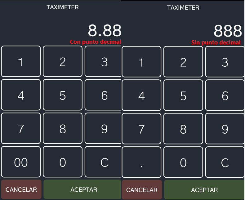 Agregará un punto decimal antes de los últimos 2 dígitos ingresados en el App de Conductor. Por ejemplo, con esta opción deshabilitada, si escribe el número 8 tres veces, aparecerá como “888”, pero si la opción está habilitada, aparecerá como “8.88”.