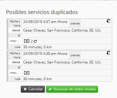 Si esta función está habilitada, al crear un nuevo Servicio, el sistema buscará automáticamente Servicios recientes para identificar si el operador de despacho está potencialmente creando un Servicio duplicado. El sistema avisará al operador de despacho y le pedirá que confirme si desea reservar el servicio de todos modos.