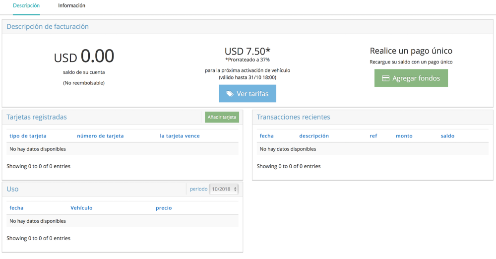 En la sección de facturación, podrás agregar fondos, activar vehículos y ver tus tarifas más otra información.