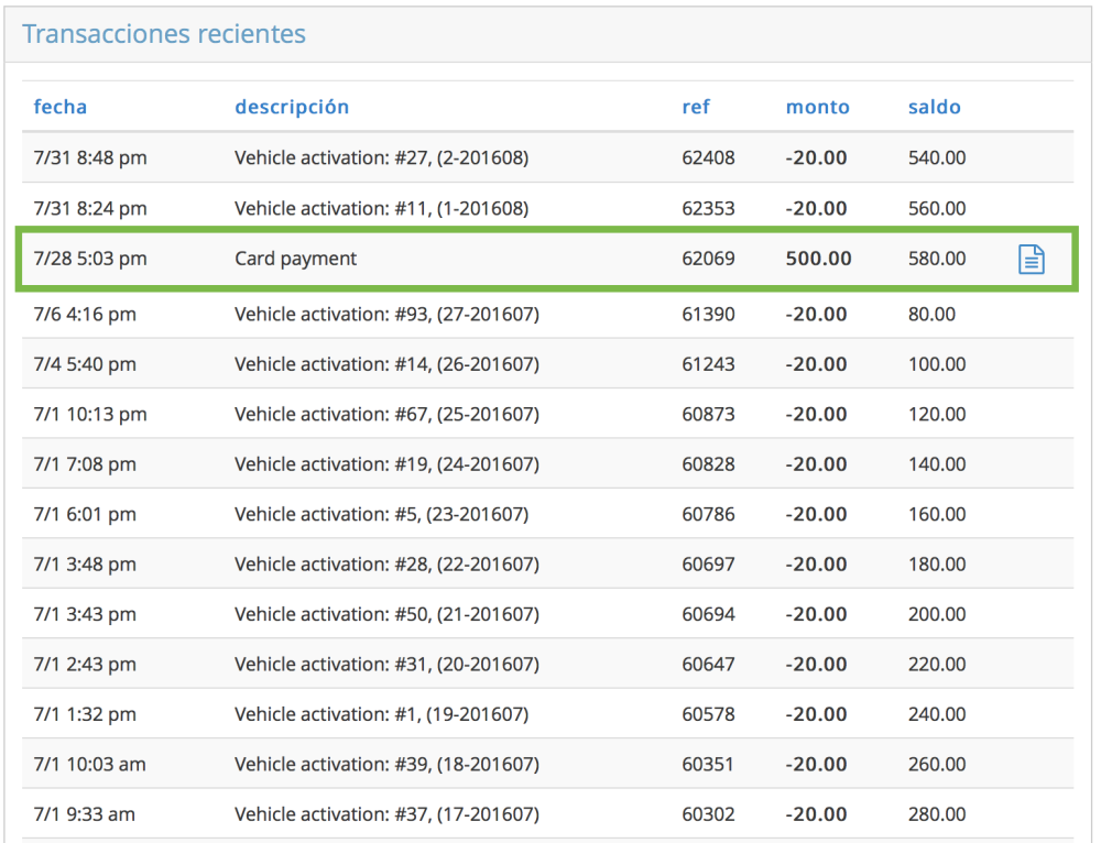 Aquí puedes ver el estado de tu cuenta de TaxiCaller con las transacciones ordenadas por fecha. Cada vez que actives un vehículo lo verás en esta sección. Si agregas fondos, también aparecerá como Pago con tarjeta y podrás ver el recibo si haces clic en el icono azul en la última columna.