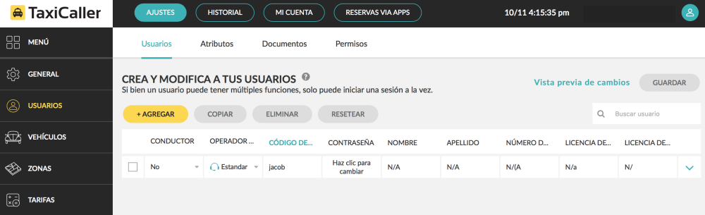 Aquí puedes agregar y administrar tus usuarios, conductores, operadores de despacho y mensajeros. La primera vez que crees tu cuenta en TaxiCaller tendrás automáticamente al menos un conductor y un operador de despacho para que puedas comenzar a probar el sistema sin complicaciones adicionales.