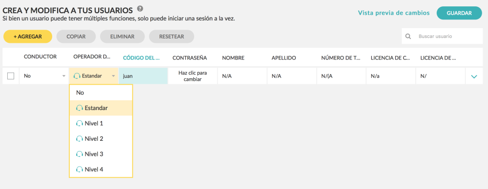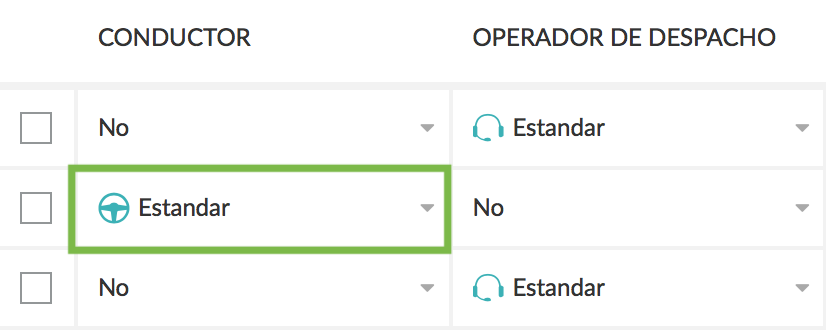 - Para hacer que el usuario sea sólo un operador de despacho, selecciona “No” en la columna del conductor y “Estándar” debajo de la columna operador de despacho.