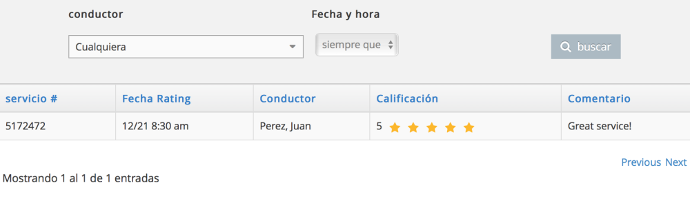 Cuando tus pasajeros asignen calificaciones a tus conductores, puedes consultar los resultados en esta sección en Historial > Calificaciones del Conductor.