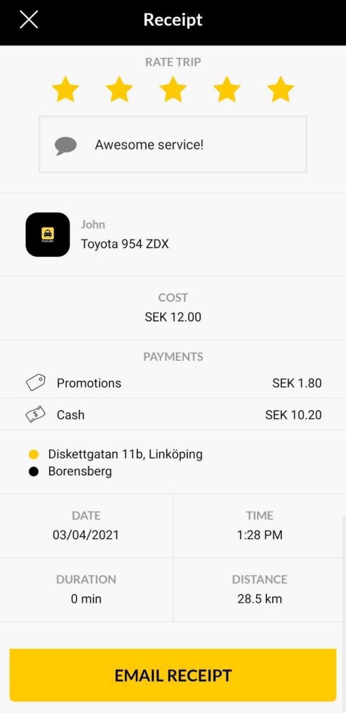 As mentioned in the previous step, once the driver completes the job, a receipt will automatically appear on the screen on the passenger app, outlining the details of the ride. Here, you can see both the costs (taxi fare, possible extras) and what payment methods were used to pay for the ride as specified by the driver (in this example voucher and cash.)