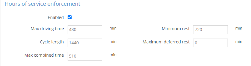 In the example below, drivers can work a maximum of 8 hours (480 min) and have a 1-hour break on top of that. The total work day will then be 9 hours including breaks in a 24-hour (1440 min) period and require a 12-hour (720 min) rest before the next shift.