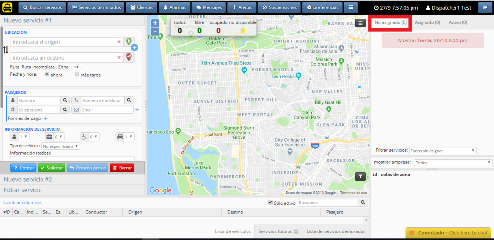 Una vez haya finalizado la “Oferta a todos los conductores” , si ningún conductor acepta el servicio, el servicio se irá a la pestaña de “No Asignado” en la Central de Despacho. Donde podrás asignar el servicio manualmente a un conductor.