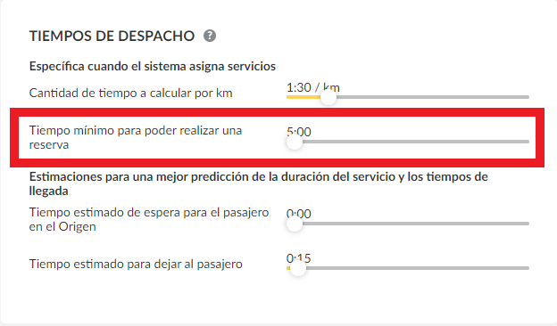 Tiempo mínimo para poder realizar una reserva: controla el tiempo mínimo de asignación (T-menos) que el sistema recomendará para un trabajo programado para más tarde. Puede ver este tiempo de asignación en la consola de despacho. Un despachador aún podrá elegir manualmente un tiempo de asignación anterior.