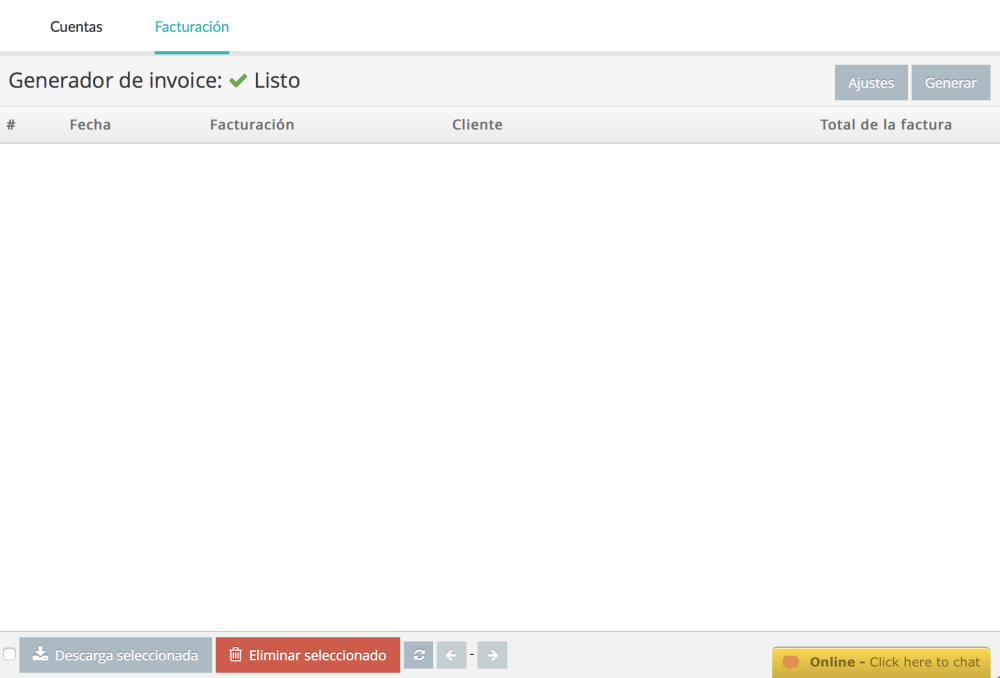 - Selecciona las facturas de las compañías que necesites y haz clic en el botón Descargar seleccionado. Si deseas eliminar facturas, haz clic en el botón Eliminar seleccionado. Siempre puedes generar las facturas de nuevo.
