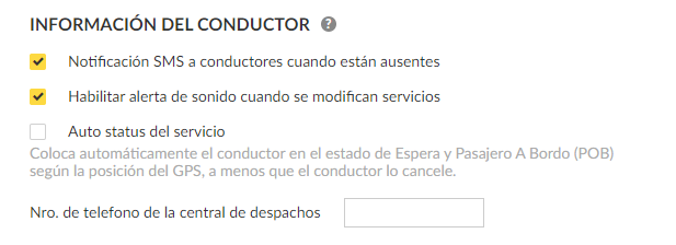 Si está habilitado, te permitirá notificar al conductor (a través de SMS) cuando esté con estado de Ausente en el App de Conductor que hay un servicio disponible.
