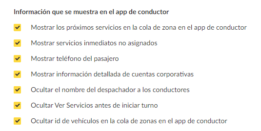 En esta sección, podrás administrar todas las funciones sobre cómo te gustaría mostrar la información del servicio al conductor.