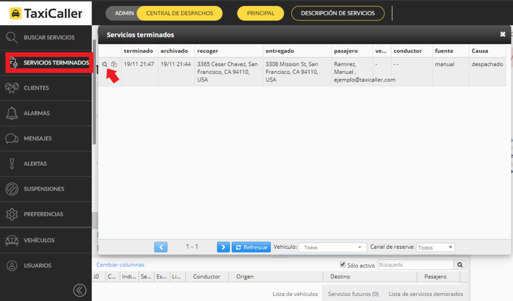 - Una vez que encuentres el servicio terminado, que contiene el pasajero que deseas bloquear, haz clic en el icono de búsqueda.