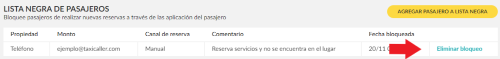 El pasajero en la lista negra se mostrará en el panel de administración en Mi Cuenta> Bloqueo de Usuarios.