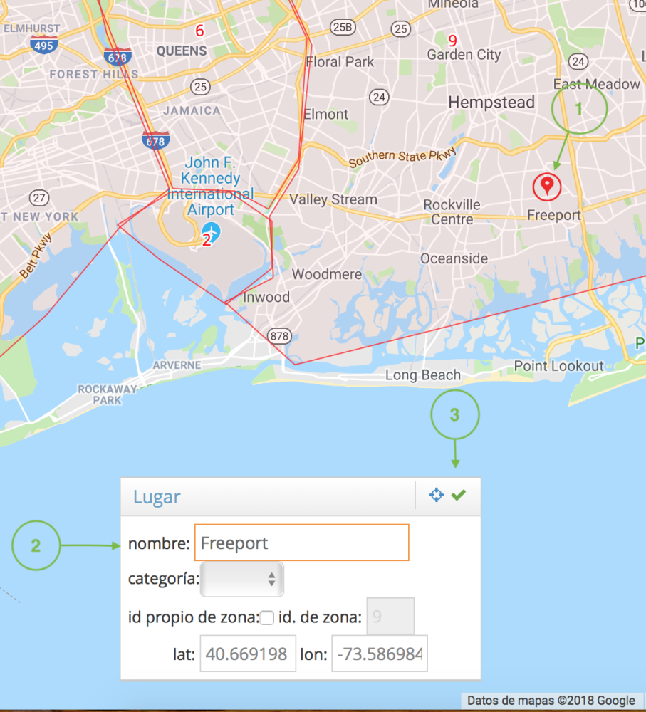 1. Mueve la marca roja al lugar deseado. 2. Ingresa un nombre. 3. Haz clic en la marca de verificación verde para guardar.