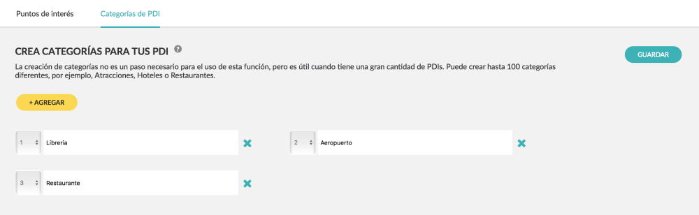 Crear categorías no es un paso necesario para el uso de esta función, pero es útil cuando tienes una gran cantidad de PDIs. Puedes crear hasta 100 categorías diferentes, por ejemplo, Bibliotecas o Restaurantes.
