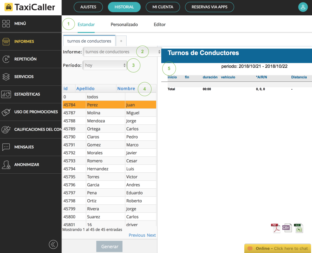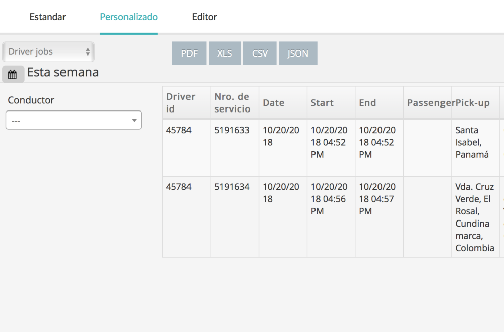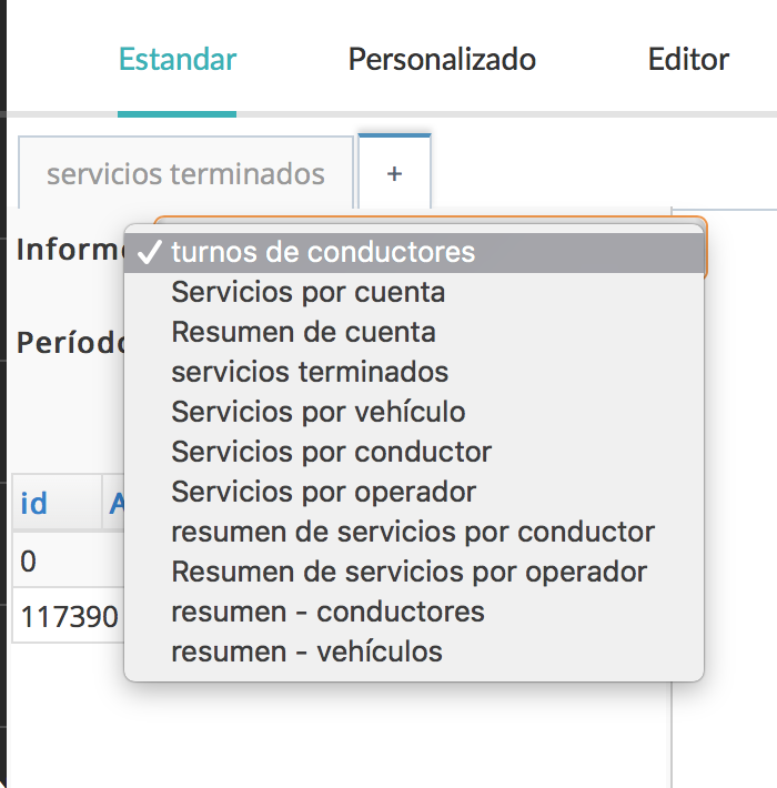- Selecciona el tipo de informe, por ejemplo tarifas de conductores