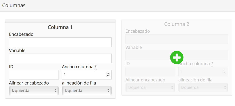 Cada columna que aparecerá en el editor estará representada por uno de estos pequeños paneles. Para crear uno, simplemente haz clic en el signo verde + y luego ingresa la información