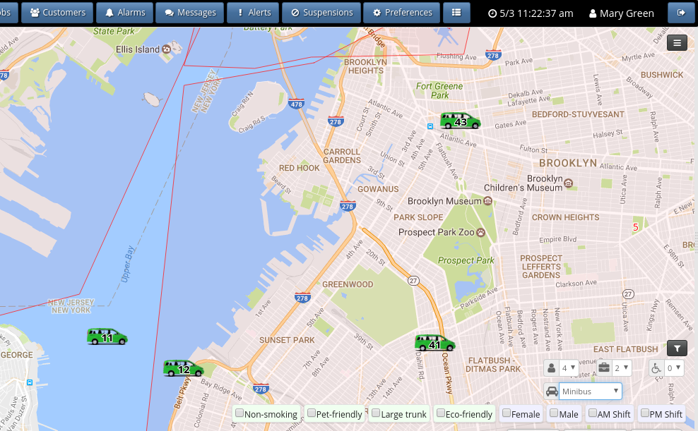 En el centro de la pantalla encontrarás el mapa con los vehículos y sus posiciones en tiempo real. En la parte superior izquierda también puedes ver cuantos vehículos estan activos, disponibles, ocupados o ausentes.