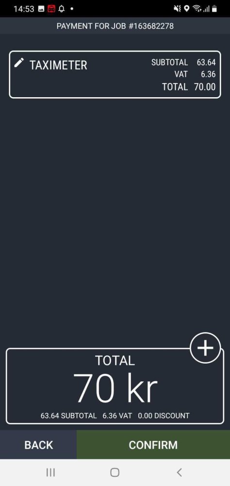 At the end of a job, you can add extra fees to a job, for example, an extra charge for waiting. This and the features below may require that “detailed payments” are active in the Dispatch Settings in the Admin Panel. Press the CONFIRM button once you are done adding the extra fees.