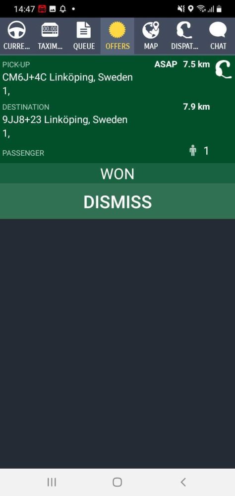 Once you and other drivers accept the offer, the system will then determine who wins the bid. This selection is based on factors that can be chosen from the Dispatch Settings in the Admin Panel, for example, the closest vehicle, or the one that has waited for the longest (first in zone queue).
