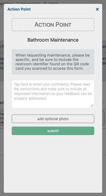 Action Point QR codes can be printed on paper, stickers, or magnets and placed in key onsite locations, such as restrooms, entrances, or common areas, allowing anyone present—like tenants in an office or apartment building—to report issues or request assistance. For example, a tenant who experienced a dirty restroom could trigger a janitorial request, or a tenant who observes suspicious activity might initiate the dispatch of a security guard.