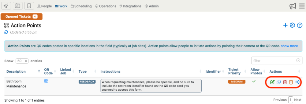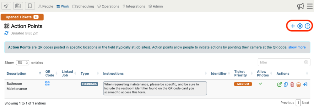 Action Points are QR codes posted in specific locations in the field (typically at job sites). Action points allow people to initiate actions by pointing their phone’s camera at the QR code and tapping the link.