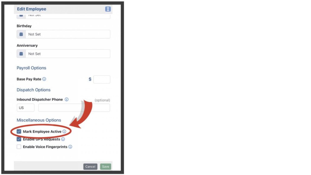 Employees can be marked as active or inactive using the Edit Employee Form. You can find how to access the Edit Employee Form in the Editing Employees section of the manual.